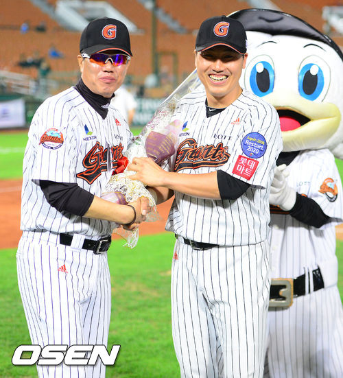 17일 오후 부산 사직구장에서 열린 '2013 한국야쿠르트 세븐 프로야구' 롯데 자이언츠와 넥센 히어로즈의 경기,5회 종료 후 클리닝타임때 롯데 장성호가 김시진 감독에게 개인통산 2000경기 출장 기념 꽃다발을 전달받고 있다