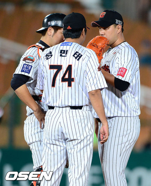 17일 오후 부산 사직구장에서 열린 '2013 한국야쿠르트 세븐 프로야구' 롯데 자이언츠와 넥센 히어로즈의 경기,3회초 넥센 박동원, 서건창 문우람에게 3타자 연속 안타를 허용한 롯데 선발투수 송승준이 정민태 투수코치와 마운드에서 이야기를 나누고 있다