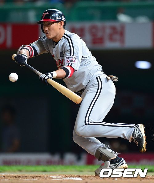7회초 LG 공격 1사 2루 상황 2번타자 박용택이 기습적인 번트안타를 대고 1루를 향해 뛰고 있다.