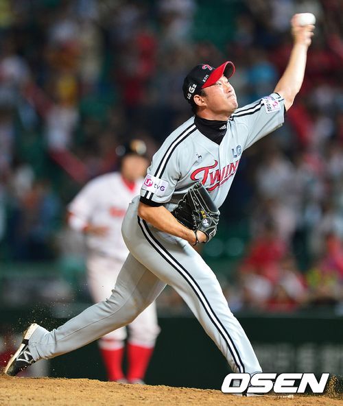 8회말 SK공격 2사 1, 2루 상황 LG 마무리투수 봉중근이 힘차게 공을 뿌리고 있다.