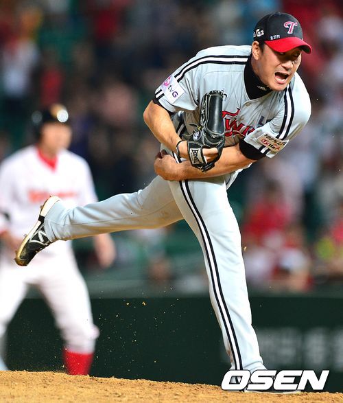 8회말 SK공격 2사 1, 2루 상황 LG 마무리투수 봉중근이 힘차게 공을 뿌리고 있다.