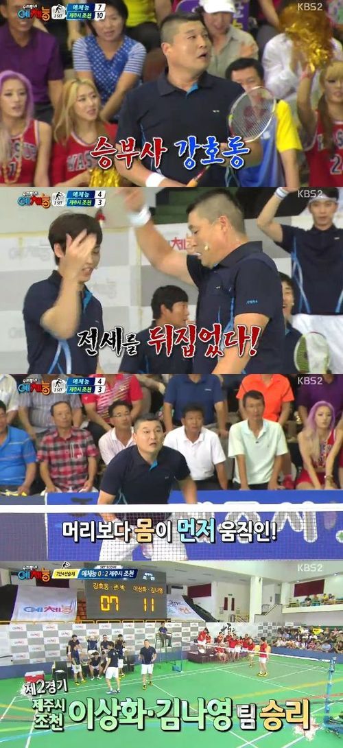 강호동, 존박은 17일 오후 방송된 KBS 2TV 예능프로그램 '우리동네 예체능'에서 제주시의 선생님과 제자 팀에 맞서 배드민턴 경기를 펼쳤다.