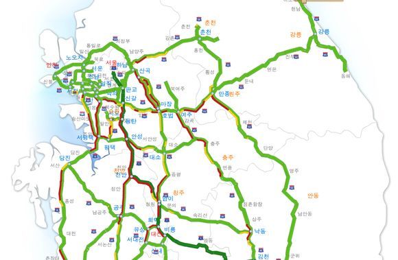 중부고속도로는 하남분기점부터 서행, 일죽나들목까지 늘어서 있는 상태다. 일죽나들목~대소분기점 구간만 잠시 원활하다. 제2중부고속도로 역시 서행과 지체로 막힌 반면 영동고속도로는 전 구간이 원활한 상태다.