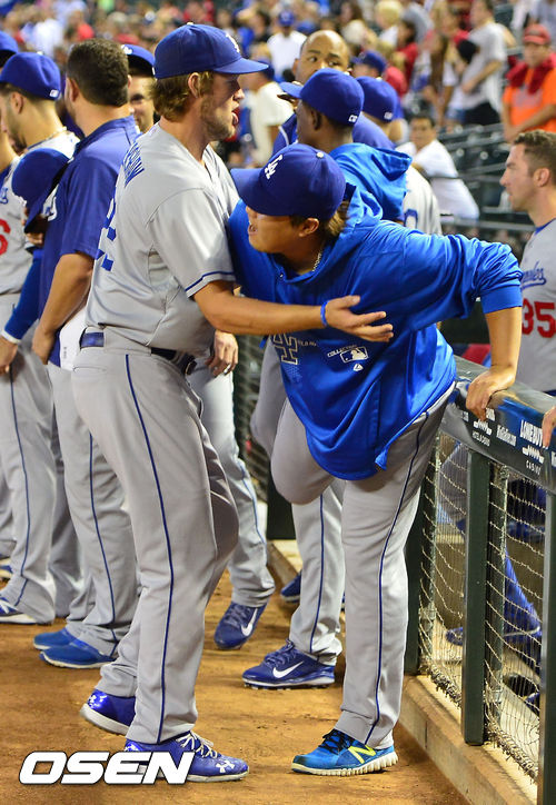 18일 (이하 한국시간) 미국 애리조나 피닉스 체이스필드에서 열린 2013 메이저리그 애리조나 다아아몬드백스와 LA 다저스 경기, 덕아웃에서 다저스 류현진이 담을 넘을 때 클레이튼 커쇼가 잡아주고 있다.