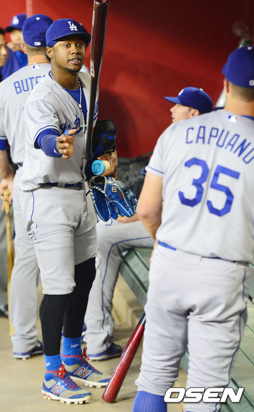 18일 (이하 한국시간) 미국 애리조나 피닉스 체이스필드에서 열린 2013 메이저리그 애리조나 다아아몬드백스와 LA 다저스 경기, 덕아웃에서 헨리 라미레스가 카푸아노에게 배트를 던져주고 있다.