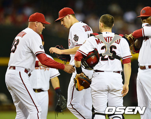 18일 (이하 한국시간) 미국 애리조나 피닉스 체이스필드에서 열린 2013 메이저리그 애리조나 다아아몬드백스와 LA 다저스 경기, 대량실점 후 3회초 무사 주자 없는 상황에서 맷 켐프가 중전 2루타를 날린 후 애리조나 선발 패트릭 코빈이 강판 당하고 있다.