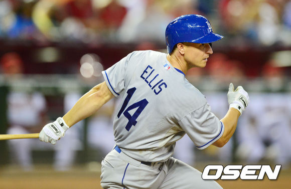 18일 (이하 한국시간) 미국 애리조나 피닉스 체이스필드에서 열린 2013 메이저리그 애리조나 다아아몬드백스와 LA 다저스 경기, 4회초 1사 주자 2루 다저스의 마크 엘리스가 1타점 적시타를 날리고 있다.