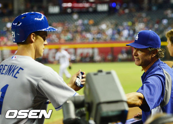 18일 (이하 한국시간) 미국 애리조나 피닉스 체이스필드에서 열린 2013 메이저리그 애리조나 다아아몬드백스와 LA 다저스 경기, 4회초 1사 주자 2루 다저스의 마크 엘리스의 1타점 적시타때 홈을 밟은 그레인키가 돈 매팅리 감독과 하이파이브를 하고 있다.