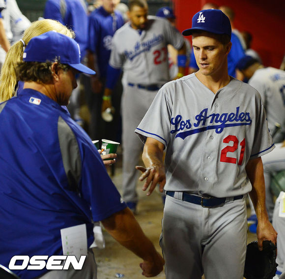 18일 (이하 한국시간) 미국 애리조나 피닉스 체이스필드에서 열린 2013 메이저리그 애리조나 다아아몬드백스와 LA 다저스 경기, 4회말을 마친 다저스 그레인키가 덕아웃에서 돈 매팅리 감독과 하이파이브를 하고 있다.