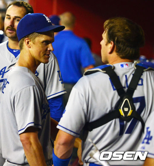 18일 (이하 한국시간) 미국 애리조나 피닉스 체이스필드에서 열린 2013 메이저리그 애리조나 다아아몬드백스와 LA 다저스 경기, 4회말을 마친 다저스 그레인키가 A.J 엘리스와 얘기를 나누고 있다.