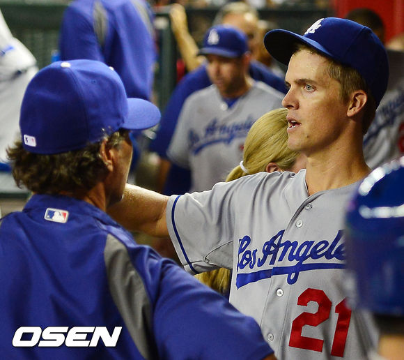 18일 (이하 한국시간) 미국 애리조나 피닉스 체이스필드에서 열린 2013 메이저리그 애리조나 다아아몬드백스와 LA 다저스 경기, 4회말을 마친 다저스 그레인키가 덕아웃에서 돈 매팅리 감독과 얘기를 나누고 있다.