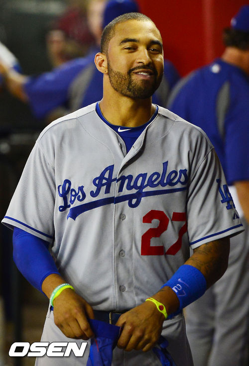 18일 (이하 한국시간) 미국 애리조나 피닉스 체이스필드에서 열린 2013 메이저리그 애리조나 다아아몬드백스와 LA 다저스 경기, 6회를 덕아웃에서 맷 켐프가 취재진을 보고 미소짓고 있다.