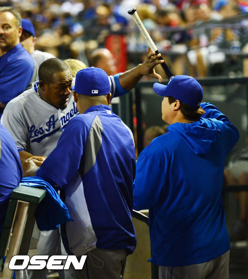 18일 (이하 한국시간) 미국 애리조나 피닉스 체이스필드에서 열린 2013 메이저리그 애리조나 다아아몬드백스와 LA 다저스 경기, 덕아웃에서 다저스 유리베가 류현진의 머리를 치고 도망가자 류현진이 배트를 들고 쫓아가고 있다.