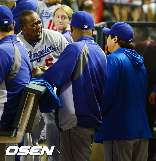 18일 (이하 한국시간) 미국 애리조나 피닉스 체이스필드에서 열린 2013 메이저리그 애리조나 다아아몬드백스와 LA 다저스 경기, 덕아웃에서 다저스 유리베가 류현진의 머리를 치고 도망가자 류현진이 배트를 들고 쫓아와 배트로 유리베를 찌르고 있다.