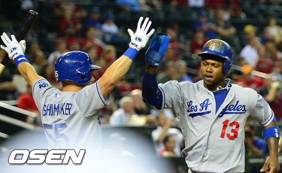 18일 (이하 한국시간) 미국 애리조나 피닉스 체이스필드에서 열린 2013 메이저리그 애리조나 다아아몬드백스와 LA 다저스 경기, 8회초 2사 주자 1루 다저스 마이클 영의 3루타 때 홈을 밟은 라미레스가 슈마커와 하이파이브를 하고 있다.