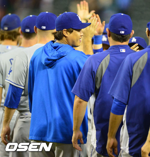 경기를 마치고 다저스 류현진이 환하게 미소지으며 동료들과 하이파이브를 하고 있다. / rumi@osen.co.kr