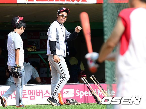 18일 오후 인천 문학구장에서 열리는 '2013 한국야쿠르트 세븐 프로야구' SK 와이번스와 LG 트윈스의 경기 시작전 이병규가 SK 선수들의 훈련 모습을 바라보며 외야로 향하고 있다.