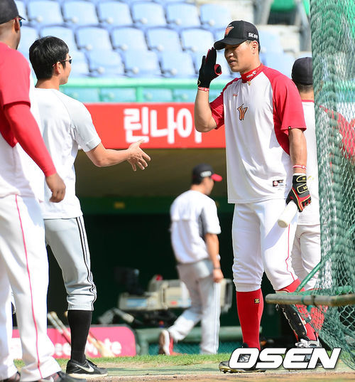 18일 오후 인천 문학구장에서 열리는 '2013 한국야쿠르트 세븐 프로야구' SK 와이번스와 LG 트윈스의 경기 시작전 김상현이 권용관에게 인사를 하고 있다.