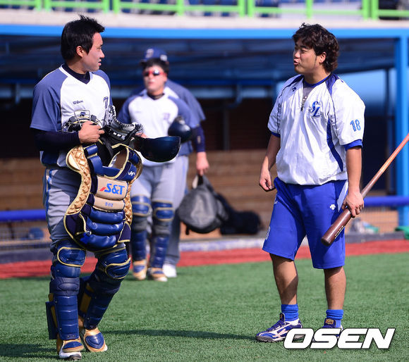 18일 오후 포항구장에서 열린 '2013 한국야쿠르트 세븐 프로야구' 삼성 라이온즈와 NC 다이노스의 경기에 앞서 삼성 박석민과 NC 김태군이 이야기를 나누고 있다.