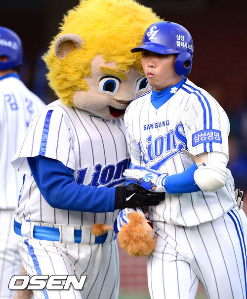 18일 오후 포항구장에서 열린 '2013 한국야쿠르트 세븐 프로야구' 삼성 라이온즈와 NC 다이노스의 경기, 2회말 1사 삼성 이상훈이 선취 솔로홈런을 날리고 홈런 인형을 받고 있다. 통산 1호 홈런.