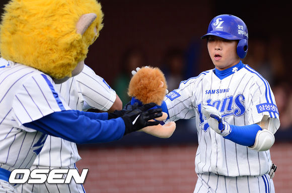 18일 오후 포항구장에서 열린 '2013 한국야쿠르트 세븐 프로야구' 삼성 라이온즈와 NC 다이노스의 경기, 2회말 1사 삼성 이상훈이 선취 솔로홈런을 날리고 홈런 인형을 받고 있다. 통산 1호 홈런.