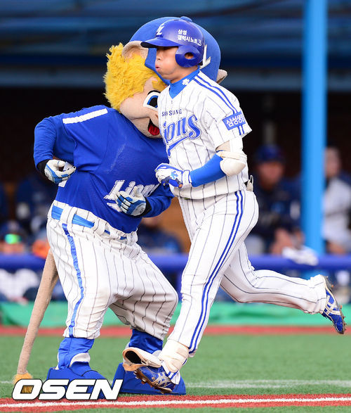 18일 오후 포항구장에서 열린 '2013 한국야쿠르트 세븐 프로야구' 삼성 라이온즈와 NC 다이노스의 경기, 2회말 1사 삼성 이상훈이 선취 솔로홈런을 날리고 삼성 마스코트의 축하를 받고 있다. 통산 1호 홈런.
