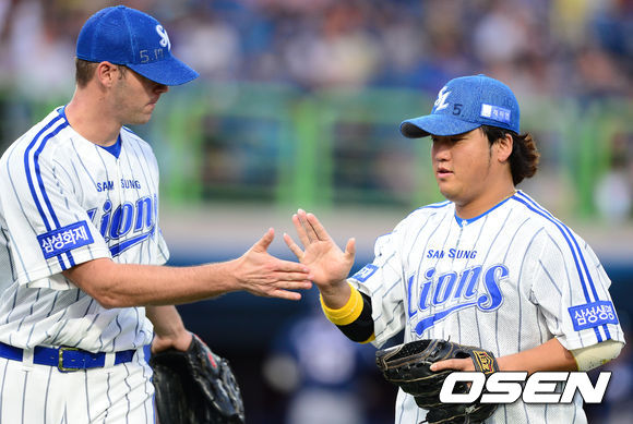 18일 오후 포항구장에서 열린 '2013 한국야쿠르트 세븐 프로야구' 삼성 라이온즈와 NC 다이노스의 경기, 5회초 삼성 최재원의 타구를 삼성 박석민 3루수가 호수비 펼치며 잡아냈다. 이닝종료 후 밴덴헐크가 박석민과 하이파이브를 하며 더그아웃으로 들어가고 있다