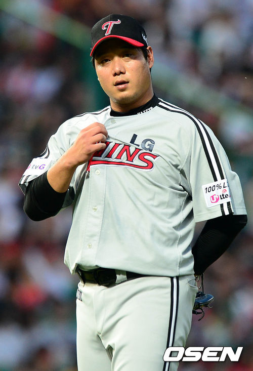 18일 오후 인천 문학구장에서 열린 '2013 한국야쿠르트 세븐 프로야구' SK 와이번스와 LG 트윈스의 경기 4회말 1사 박재상에게 솔로홈런을 허용한 류제국이 땀을 닦고 있다.