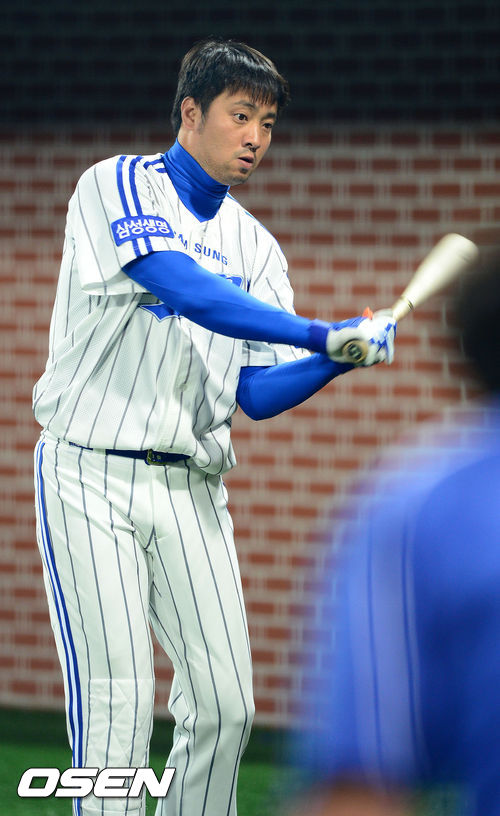 18일 오후 포항구장에서 열린 '2013 한국야쿠르트 세븐 프로야구' 삼성 라이온즈와 NC 다이노스의 경기, 삼성 채태인이 몸을 풀고 있다. 채태인은 허리부상 중인 이승엽을 대신해서 1군 엔트리에 등록됐다.