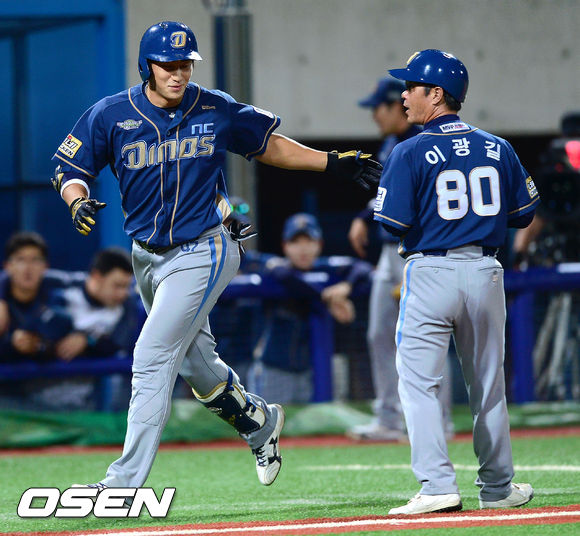 18일 오후 포항구장에서 열린 '2013 한국야쿠르트 세븐 프로야구' 삼성 라이온즈와 NC 다이노스의 경기, 6회초 2사 2루 NC 나성범이 2점 홈런을 날리고 이광길 코치와 하이파이브를 하고 있다.