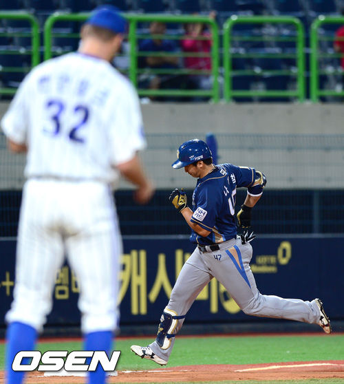 18일 오후 포항구장에서 열린 '2013 한국야쿠르트 세븐 프로야구' 삼성 라이온즈와 NC 다이노스의 경기, 6회초 2사 2루 NC 나성범이 2점 홈런을 날리고 베이스를 돌고 있다