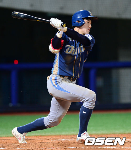 18일 오후 포항구장에서 열린 '2013 한국야쿠르트 세븐 프로야구' 삼성 라이온즈와 NC 다이노스의 경기, 6회초 2사 2루 NC 박민우가 1타점 적시타를 날리고 있다.