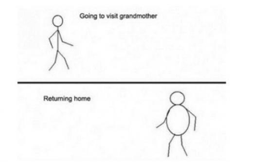해외 네티즌이 작성한 것으로 보이는 이 만화에는 할머니를 만나러 가는 아이의 모습과 돌아오는 모습이 각각 아래와 위에 담겨 있다. 'Going to visit grandmother(할머니 만나러 가는 길)'이라는 위 컷에서는 훌쭉한 배로 나섰다. 그런데 'Returning Home(집으로 오는 길)'이라는 설명이 붙은 아래 컷에는 한껏 부른 배가 인상적이다.