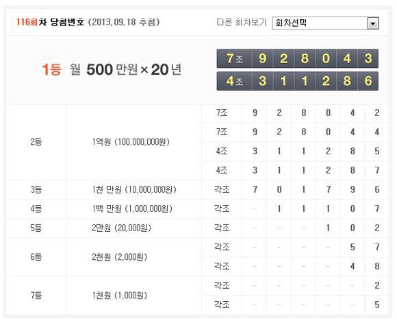18일 JTBC를 통해 생방송으로 진행된 연금복권520 추첨에서 116회 당첨번호는 1등 4조 311286, 7조 928043으로 선정됐다.