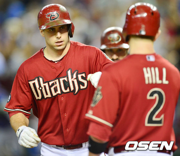 19일 (이하 한국시간) 미국 애리조나 피닉스 체이스필드에서 열린 2013 메이저리그 애리조나 다아아몬드백스와 LA 다저스 경기, 1회말 1사 주자 2루 애리조나 골드슈미트가 우중월 투런 홈런을 날린 후 홈에서 힐과 하이파이브를 하고 있다.