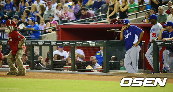 19일 (이하 한국시간) 미국 애리조나 피닉스 체이스필드에서 열린 2013 메이저리그 애리조나 다아아몬드백스와 LA 다저스 경기, 애리조나 캐릭터인 디벅스 박스터가 팬티를 보이며 엉덩이 춤을 추며 LA 다저스를 도발하고 있다.