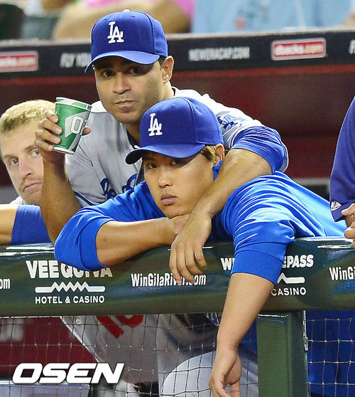 19일 (이하 한국시간) 미국 애리조나 피닉스 체이스필드에서 열린 2013 메이저리그 애리조나 다아아몬드백스와 LA 다저스 경기,헤어스톤과 류현진이 덕아웃에서 경기를 지켜보고 있다.