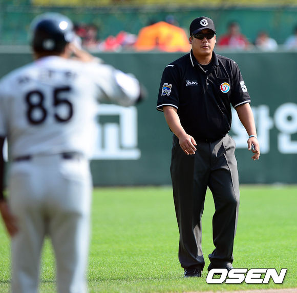 19일 오후 인천 문학구장에서 열린 '2013 한국야쿠르트 세븐 프로야구' SK 와이번스와 LG 트윈스의 경기 시작전 3루심 배병두가 최태원 코치와 인사를 나누고 있다.