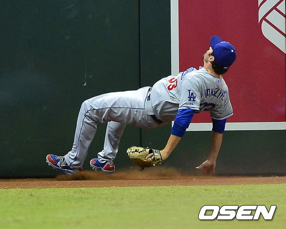 8회말 1사 주자 1루 애리조나 아론 힐의 2루타때 다저스 좌익수 스캇 반 슬라이크가 넘어지고 있다. / rumi@osen.co.kr