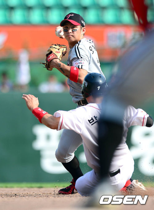 19일 오후 인천 문학구장에서 열린 '2013 한국야쿠르트 세븐 프로야구' SK 와이번스와 LG 트윈스의 경기 3회말 무사 1루 정상호의 병살타 상황, 오지환이 2루에서 박진만을 포스아웃 시킨 후 1루로 송구하고 있다.