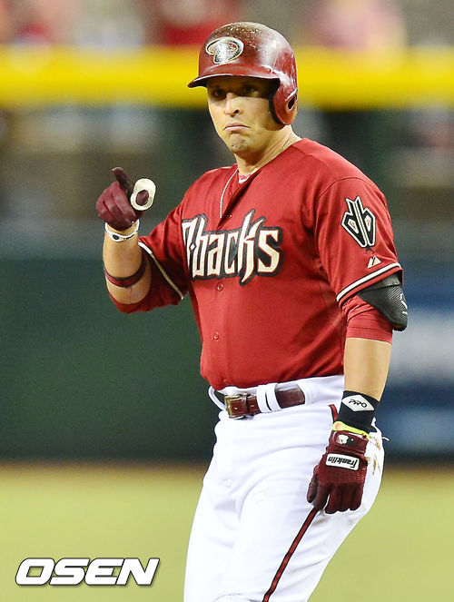 8회말 1사 주자 1,2루 애리조나 마틴 프라도가 좌중간 2타점 적시타를 날린 후 사인을 보내고 있다. / rumi@osen.co.kr