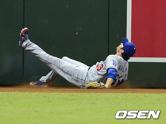 8회말 1사 주자 1루 애리조나 아론 힐의 2루타때 다저스 좌익수 스캇 반 슬라이크가 넘어지고 있다. / rumi@osen.co.kr