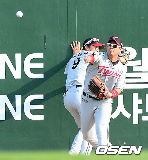 19일 오후 인천 문학구장에서 열린 '2013 한국야쿠르트 세븐 프로야구' SK 와이번스와 LG 트윈스의 경기 5회말 1사 2루 정상호의 좌중간 2루타 타구를 이병규가 놓치자 정의윤이 잡아 송구하고 있다.