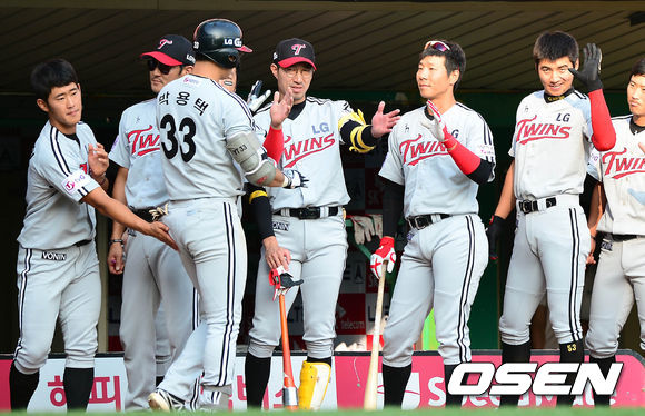 19일 오후 인천 문학구장에서 열린 '2013 한국야쿠르트 세븐 프로야구' SK 와이번스와 LG 트윈스의 경기 6회초 2사 박용택이 솔로포를 치고 덕아웃에서 동료들과 하이파이브를 하고 있다.