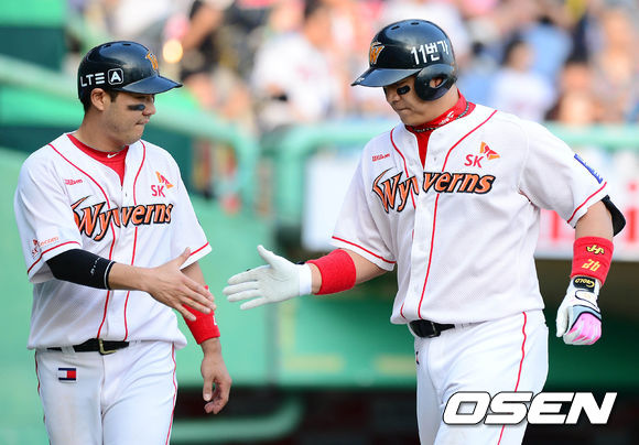 19일 오후 인천 문학구장에서 열린 '2013 한국야쿠르트 세븐 프로야구' SK 와이번스와 LG 트윈스의 경기 6회말 1사 2루 정상호가 투런포를 치고 홈에서 박진만과 하이파이브를 하고 있다.