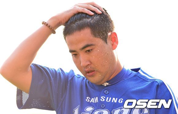 1회말 두산 공격을 삼자범퇴로 막아낸 삼성 선발 장원삼이 더그아웃으로 들어오며 머리에 묻은 땀을 털어내고 있다.