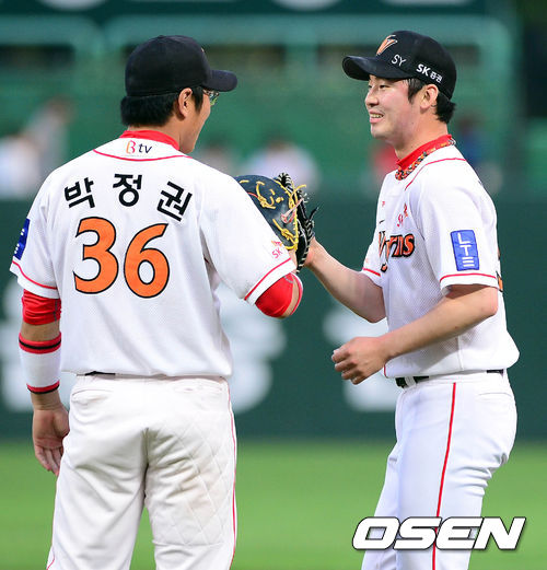 19일 오후 인천 문학구장에서 열린 '2013 한국야쿠르트 세븐 프로야구' SK 와이번스와 LG 트윈스의 경기 종료 후 진해수와 박정권이 하이파이브를 하고 있다.