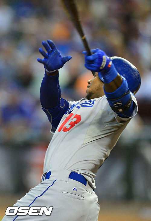 20일 (이하 한국시간) 미국 애리조나 피닉스 체이스필드에서 열린 2013 메이저리그 애리조나 다아아몬드백스와 LA 다저스 경기, 3회말 1사 주자 1,3루 핸리 라미레스가 선취 좌월 스리런 홈런을 날리고 있다.