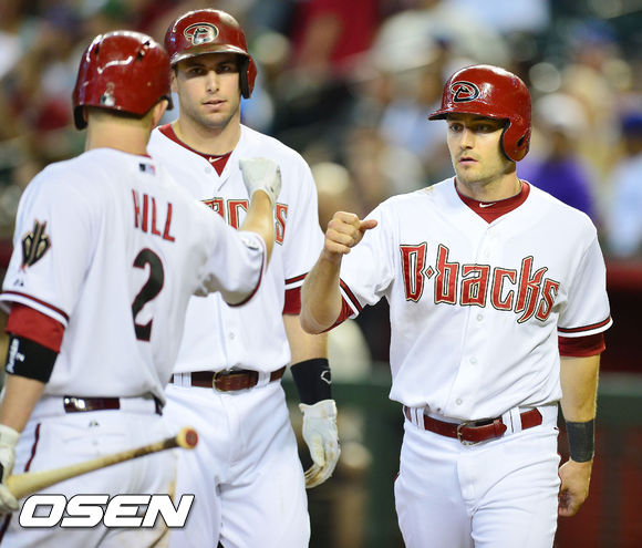 20일 (이하 한국시간) 미국 애리조나 피닉스 체이스필드에서 열린 2013 메이저리그 애리조나 다아아몬드백스와 LA 다저스 경기, 3회말 무사 주자 2,3루 애리조나 프라도의 동점 2타점 적시타때 홈을 밟은 폴락과 골드슈미트가 힐과 하이파이브를 하고 있다.