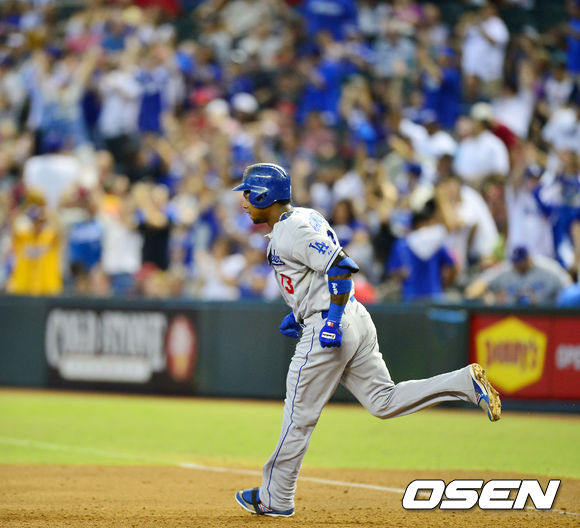 20일 (이하 한국시간) 미국 애리조나 피닉스 체이스필드에서 열린 2013 메이저리그 애리조나 다아아몬드백스와 LA 다저스 경기, 3회말 1사 주자 1,3루 핸리 라미레스가 선취 좌월 스리런 홈런을 날린 후 그라운드를 돌고 있다.